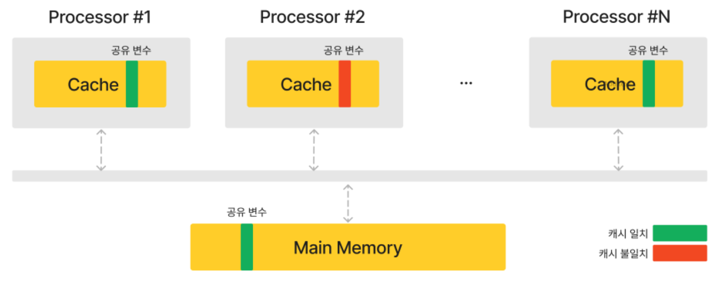 멀티스레드 환경에서 각각의 스레드들은 CPU Cache라는 작업 복사본을 가지고 있다. 이 CPU Cache는 메인 메모리에서 원본값을 읽기 전에 먼저 확인하고 있으면 CPU Cache에 있는 값을 가져온다. 하지만 각자가 CPU Cache에 변수의 복사본을 읽고 쓰기 동작을 하기 때문에 캐시가 불일치(Cache Inconsistency)하는 문제가 발생할 수 있다. 결과적으로 각 스레드가 동일한 공유 변수를 다른 값으로 바라보는 문제라고 할 수 있다.