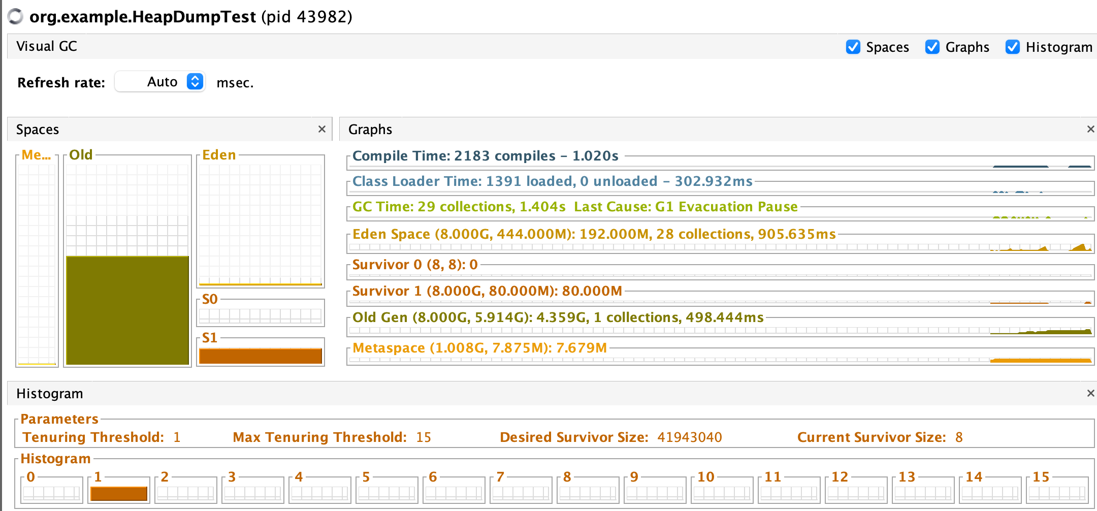 Heap Dump: 특정 시점에 JVM Heap 영역에 있는 모든 개체의 스냅샷으로 힙 덤프를 수집하여 메모리 누수 및 성능 문제를 분석할 수 있다. GC가 Heap에서 불필요한 객체를 제거하지 못하는 경우 Java VisualVM을 사용하여 해당 객체에 대한 정보를 얻을 수 있다.