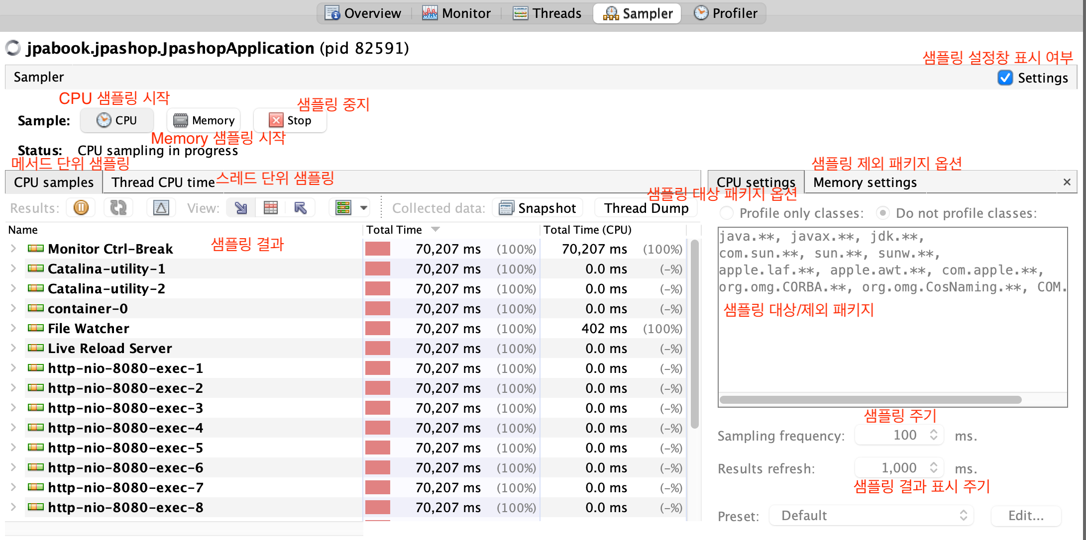 - Sampler: CPU, Memory 샘플링할 수 있다.