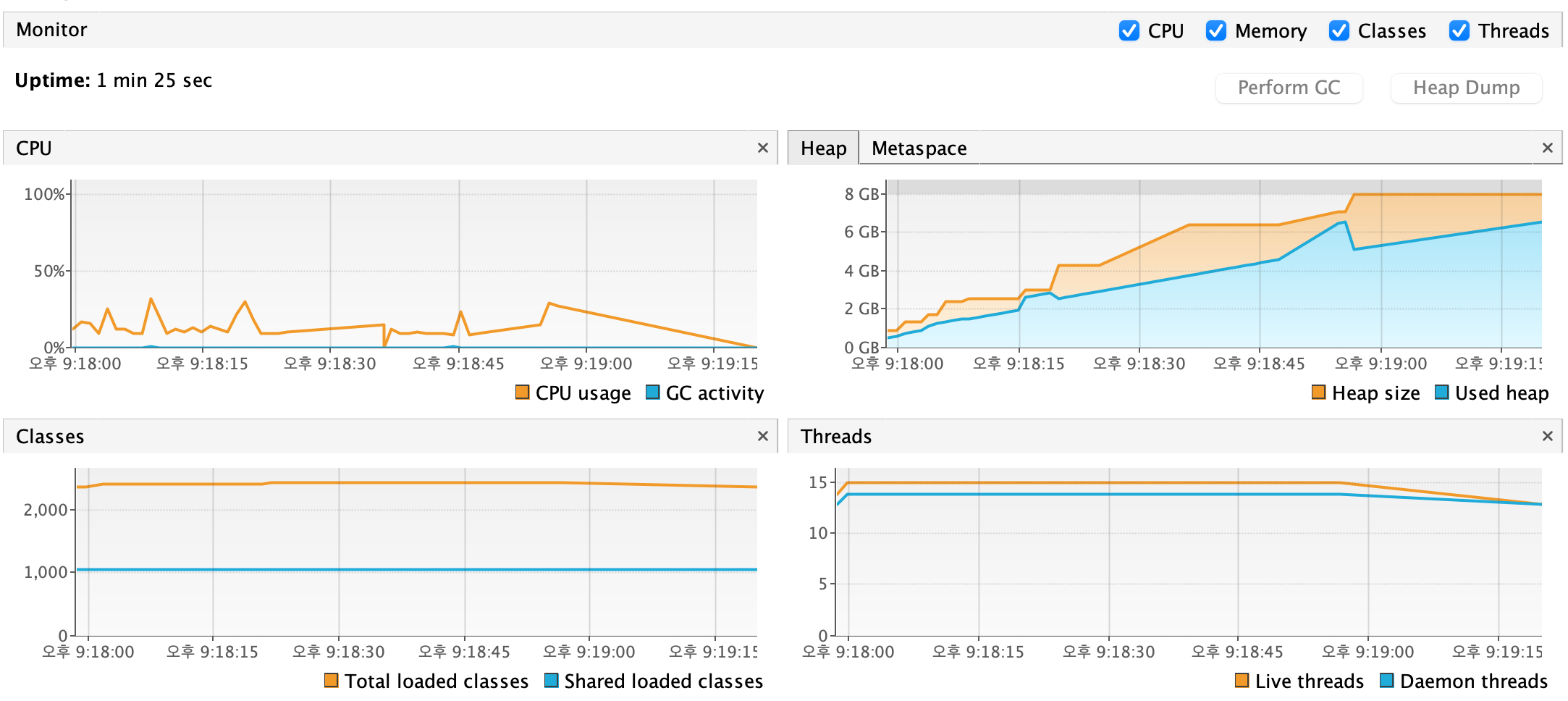 Monitor 화면에서는 위와 같이 현재 프로세스에 대한 CPU, Heap, Classes, Threads 정보를 볼 수 있다. 가끔 CPU 사용량이 100%가 되는 것을 볼 수 있는데, 이는 프로세스에서 메모리가 부족하여 OS에 메모리를 요청하면서 다시 GC를 실행하고, GC가 정상적으로 실행되지 않고 다시 메모리가 부족하여 OS에 메모리를 요청하는 것을 반복한다고 해석할 수 있다.