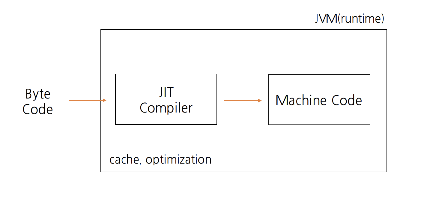 Java에서는 컴파일 언어보다 느린 성능 차이를 해결하기 위해 JVM에 JIT Compiler를 도입하고 있다. 적시에 기계어를 만들어 낸다는 의미이다. JIT Compiler는 바이트 코드를 Machine Code를 변환하는 과정에서 Machine Code를 캐시에 저장하고 활용한다. 이를 통해 반복되는 기계어 변환 과정을 줄이게 되어 성능을 향상시키고, 런타임 환경에 맞춰 코드를 최적화함으로써 추가적인 성능 향상을 이루게 한다.