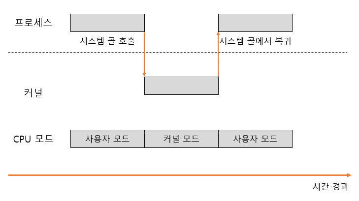 시스템 콜은 CPU의 특수한 명령을 실행해야만 호출된다. 프로세스는 보통 사용자 모드로 실행되고 있지만 커널에 처리를 요청하기 위해 시스템 콜을 호출하면 CPU에서는 인터럽트(interrupt) 이벤트가 발생해 CPU는 사용자 모드에서 커널 모드로 변경되어 커널은 요청한 내용을 처리한다. 요청한 내용 처리가 끝나면 커널 내의 시스템 콜 처리가 종료되어 다시 사용자 모드로 전환되어 프로세스의 동작을 계속 진행한다.