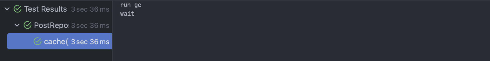 처음에는 캐시에 아무것도 없다가 postRepository.getPostById(p1);에 의해 Post 객체가 생성되고, cache에 들어가게 된다. 따라서 isNotEmpty()에서는 확인했을 때 잘 통과한다. 하지만 System.gc();을 통해서 GC를 실행하더라도 캐시가 비워지지 않기 때문에 마지막 isEmpty()에 대한 테스트가 실패하게 된다.