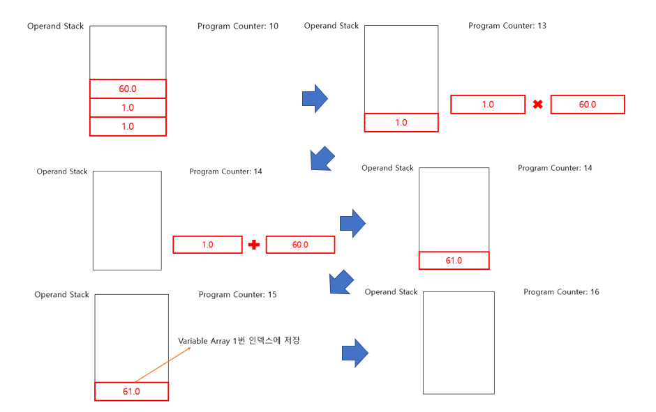 10 ldc2_v #2 <60.0> <-- Constant Pool에서 2번째 값을 가져온다. (double형 리터럴 60.0)