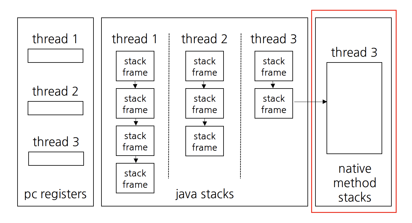 Native Method는 Java Bytecode가 아닌 다른 언어로 작성된 메서드를 의미한다. 위에서 말했듯 Native라는 단어가 나온 것은 운영체제와 직접적으로 관련이 있다는 것을 알 수 있다. JVM이 JNI(Java Native Interface)를 이용해서 성능 향상을 목적으로 C/C++로 작성된 언어로 개발된 메서드를 지원하기 위한 스택으로 스레드마다 별도로 제공한다.