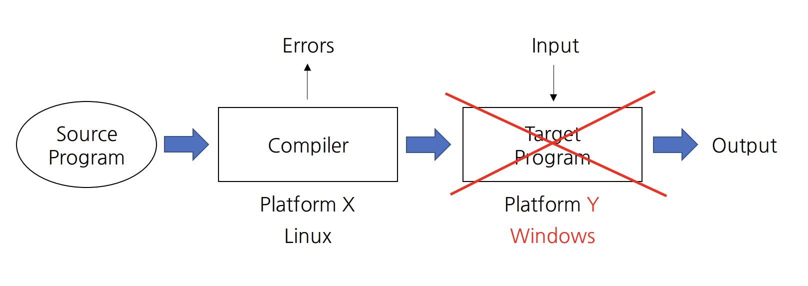 위 그림처럼 리눅스에서 컴파일해서 나온 실행파일을 윈도우에서 돌리게 되면 안돌아간다. C/C++는 컴파일 플랫폼과 타겟 플랫폼(= 운영체제 + CPU 아키텍쳐)이 다를 경우, 프로그램이 동작하지 않는다는 문제가 있었다.