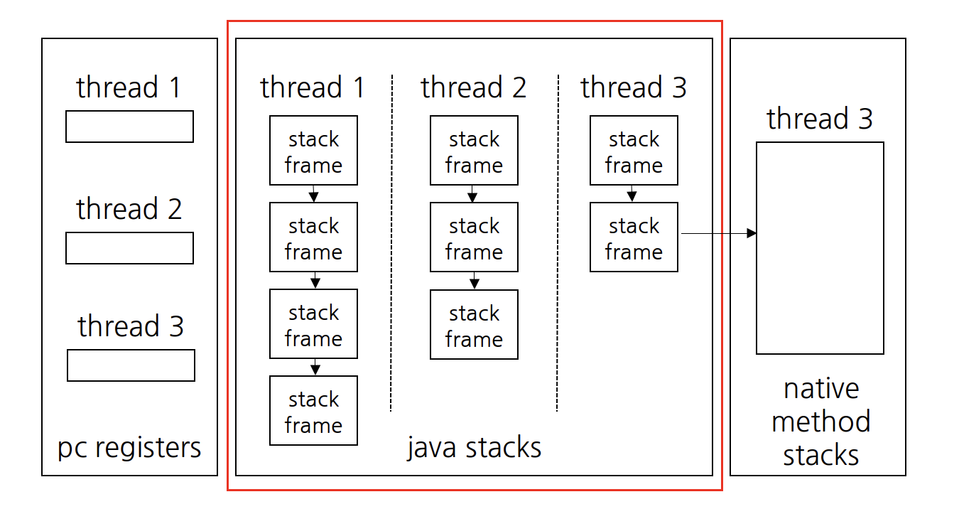 그리고 스택 프레임이라는 것이 있는데 이 스택 프레임은 메서드가 호출될 때마다 생성되고, 메서드 실행이 끝나면 스택 프레임은 pop되어 스택에서 제거된다. 따라서 제일 위에 있는 stack frame은 main 메서드이고, 그 밑에 있는 stack frame들은 main 메서드에서부터 계속 호출된 어떤 메서드들이라 할 수 있다.