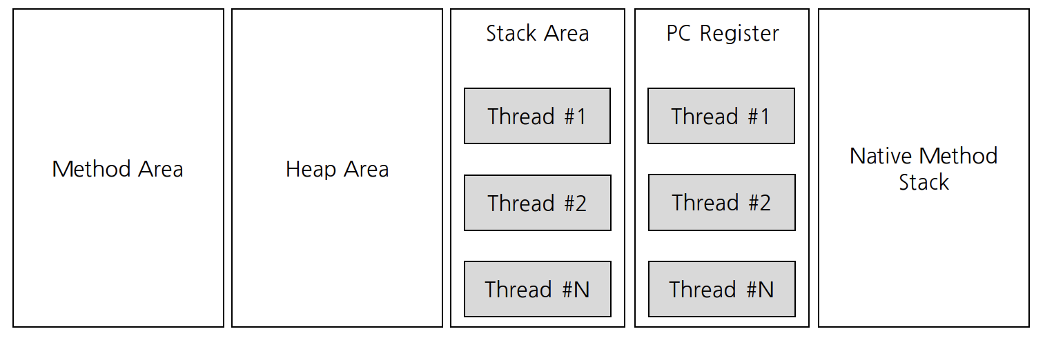 JVM은 OS로부터 메모리를 할당받은 후, Java Bytecode를 실행하기 위해 여러 가지 종류의 메모리가 필요한데 그 때 사용하는 메모리 공간이다. 이 때 스레드가 공유하는 것이 있고, 공유하지 않는 것이 있다. Method Area와 Heap Area이 모든 스레드가 공유하는 Data Area이고 Heap Area는 GC의 대상이 된다. 그리고 나머지는 스레드마다 고유하게 생성되고, 스레드 종료 시 소멸된다.