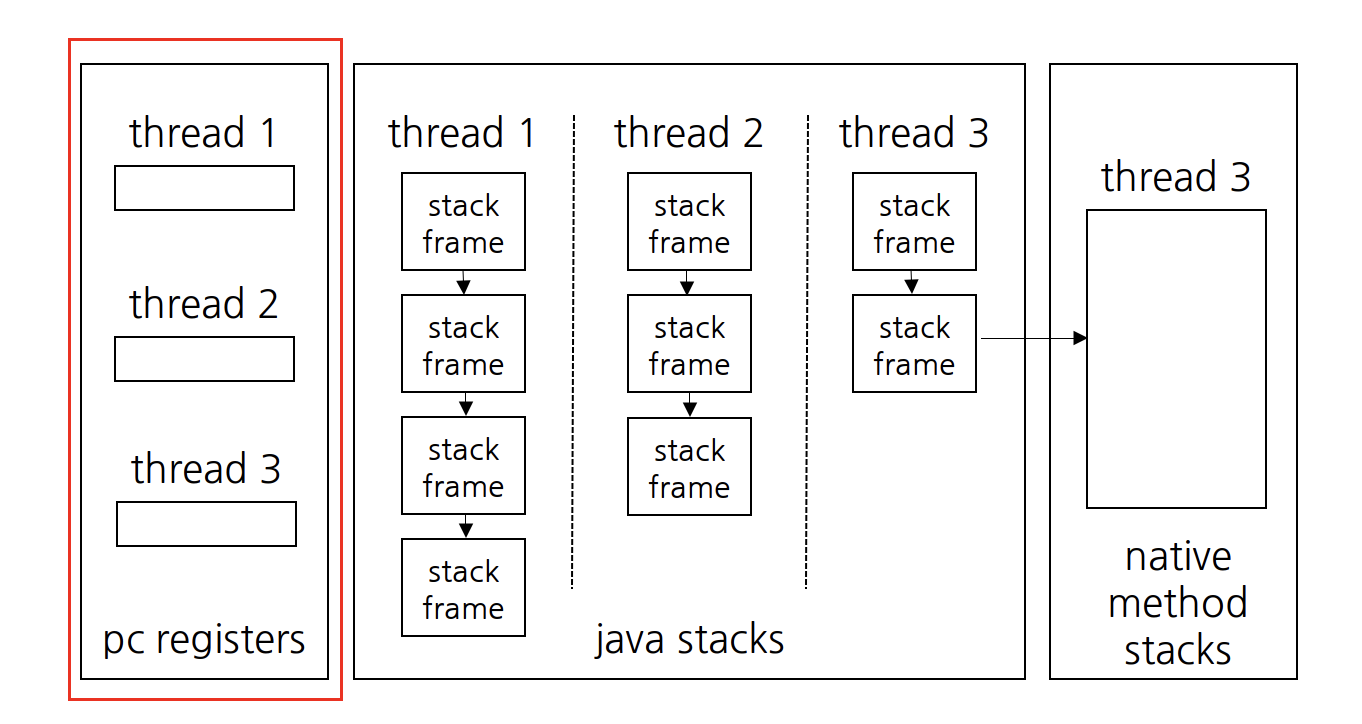 일반 CPU(EIP register)처럼 Program Counter를 가지며 현재 수행해야 할 명령어에 대한 인덱스를 저장하는 역할을 수행한다. 즉, 스레드는 항상 어떤 메서드를 실행하고 있고, 각 스레드마다 실행 흐름 즉, 별도 문맥을 가질 수 있도록 개별 PC register를 가져 해당 메서드 안에서 바이트코드 몇 번째 줄을 실행해야 하는지 나타내는 역할을 한다.