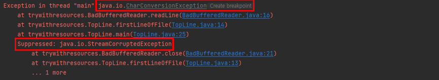 하지만 try-with-resources를 사용하면 어떻게 될까? 코드는 당연히 간결해졌고 위처럼 예외가 발생하게 되면 readLine() 메서드를 호출하면서 CharConversionException이 발생할텐데 해당 예외가 잘나올 수 있을까?