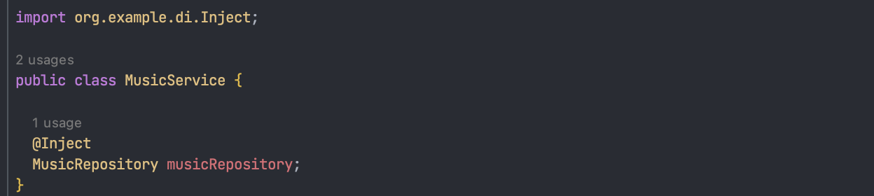 if (field.getAnnotation(Inject.class) != null) { // 필드 중에 Inject 어노테이션이 있는지 확인