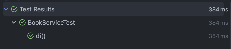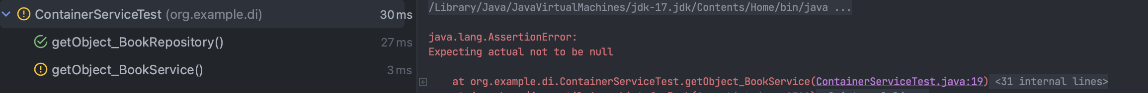 위처럼 테스트 코드를 작성하여 테스트하면 클래스 타입을 인자로 넘겨주어 해당 타입의 인스턴스를 반환받는다. 하지만 아직은 @Inject 애노테이션이 아무런 기능을 하지 않기 때문에 bookService의 bookRepository 필드는 null이므로 테스트를 통과하지 못한 것을 확인할 수 있다.