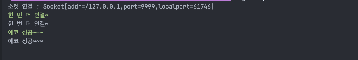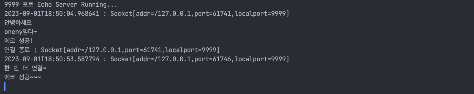 클라이언트와 에코 서버가 소켓 통신을 통해 콘솔에서 주고받은 데이터를 출력한 것을 확인할 수 있다.
