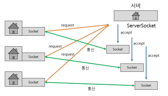 ServerSocket이 accept()할 때 리턴된 서버용 Socket은 해당 클라이언트와 통신할 수 있는 유일한 수단 즉, 클라이언트 상대용 소켓이라고 생각하면 된다. 클라이언트로부터 요청이 와 accept()할 때 요청큐에서 꺼내져 리턴된 서버용 Socket은 자동으로 포트(Port)를 할당받고, 멀티스레드 환경에서 이 Socket을 생성한 스레드 등에 줘서 클라이언트를 상대하게 한다.