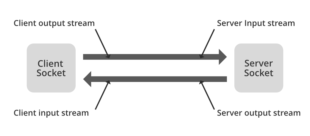 위에서 소켓은 역할에 따라 서버 소켓과 클라이언트 소켓으로 구분한다고 했는데 java.net 패키지는 이에 맞게 각각 두 개의 클래스(Socket 및 ServerSocket)를 구현하여 제공한다. 위 그림을 보면 클라이언트에서 서버에 데이터를 전송하기 위해서는 OutputStream을, 서버로부터 데이터를 응답받기 위해서는 InputStream을 사용한다. 반대로 서버에서 ServerSocket의 accept() 메서드를 통해 생성된 socket 객체는 클라이언트로부터 요청받은 데이터를 InputStream으로, 클라이언트에게 결과를 전송하기 위해서는 OutputStream을 사용하는 것을 알 수 있다.