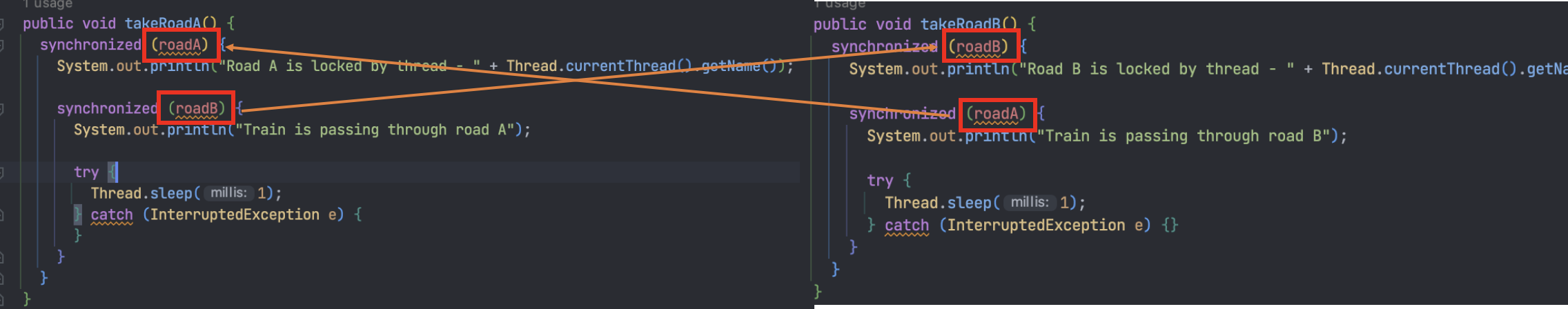 takeRoadA() 메서드가 실행되면 roadA에 대한 잠금을 설정하여 RoadA가 잠금되었다는 출력을 한 후, roadB를 통과하기 위해 다시 roadB를 잠금 설정하는 것을 확인할 수 있다. takeRoadB() 메서드도 takeRoadA()와 동작하는 것을 비슷하지만 잠금을 설정하는 순서가 반대로 동작한다.