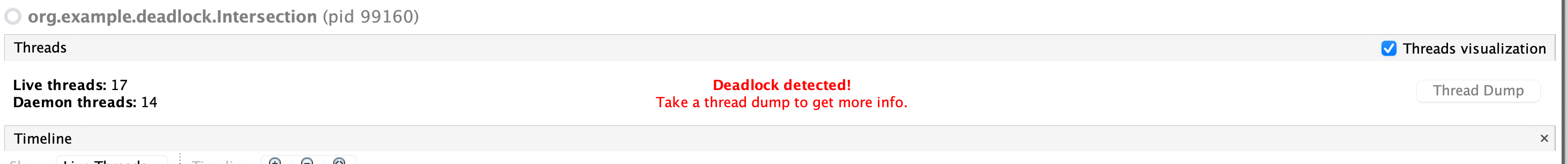 몇 번은 운이 좋게 roadA가 roadB까지 획득하면서 데드락이 발생하지 않을 수 있지만 그것도 잠시 TrainAThread와 TrainBThread가 서로의 락이 해제되기를 기다리는 데드락 상황에 빠진 것을 확인할 수 있다. 이 때, VisualVM의 Thread 탭을 확인해보면 "Deadlock detected!"라고 데드락이 발생한 것을 알려주면서 Thread Dump를 하라고 권유하는 것을 확인할 수 있다. 그럼 Thread Dump를 떠보자.