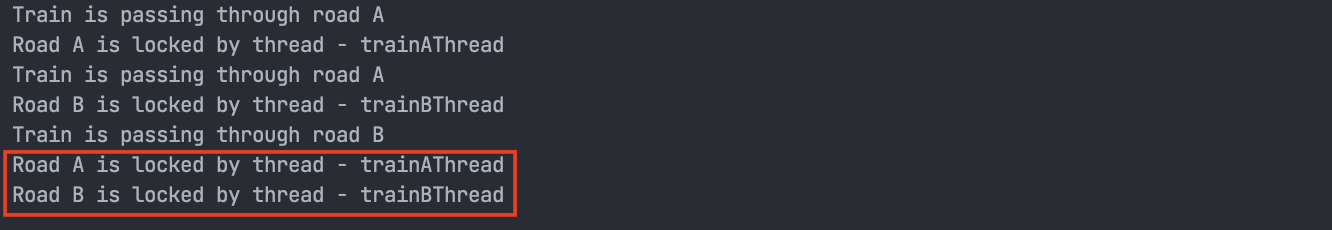 해당 클래스는 TrainA와 TrainB가 들어서는 교차로이라고 생각하면 된다. 위에서 주시해야할 메서드는 당연히 takeRoadA()와 takeRoadB() 메서드이다. 교차로는 두 개의 기차(TrainA, TrainB)가 교차로를 통과하려고 시도할 때 가로지르기 위한 잠금을 사용하여 동시에 한 번에 하나의 기차만 도로를 통과할 수 있도록 만들었다.