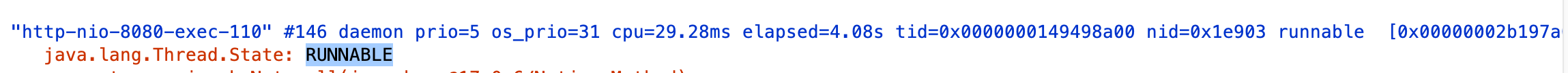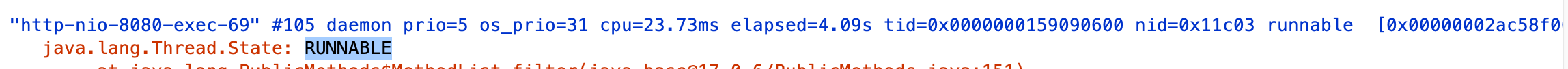 또한 Thread Dump를 떠서 RUNNABLE인 상태가 몇 개인지 확인했는데 http-nio-8080-exec-(번호)의 RUNNABLE 상태인 것이 10개인 것을 확인했고, 나머지는 TIMED_WAITING 상태였다.