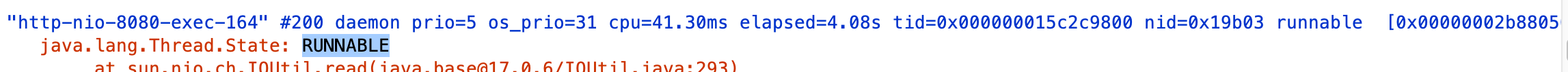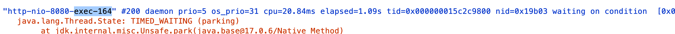 그리고 다시 빠르게 Thread Dump를 떠서 확인해보니 RUNNABLE이였던 164 스레드가 TIMED_WAITING인 것을 확인할 수 있었다. 이렇게 Synchronous + Blocking 방식이지만 하나의 요청에 대해 하나의 스레드를 할당하여 처리하고, 코어 대비 스레드 개수가 많아도 타임 슬라이싱을 통해 스레드가 빠르게 교차하면서 동시성을 나타내는 것을 확인할 수 있었다.