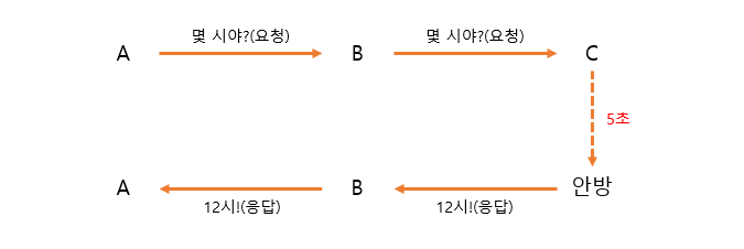 위 그림처럼 A가 B에게 몇 시인지를 요청한다고 가정해보자. 이 때, B도 시계가 없어 시계를 가지고 있는 C에게 요청을 한다. 따라서 b의 요청을 받은 거실에 있는 C는 안방에 있는 시계를 보러 걸어가 확인한 후, B에게 응답을 한다. 응답은 받은 B는 응답받은 시간을 다시 A에게 응답하여 A의 요청에 대한 작업을 모두 처리했고, A가 응답을 받기까지 5초 + α 시간이 걸렸다.
