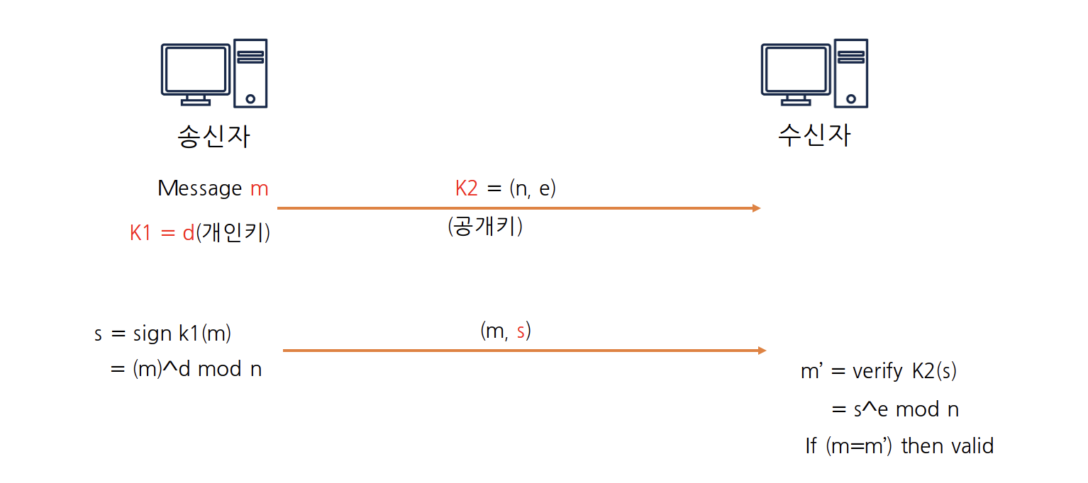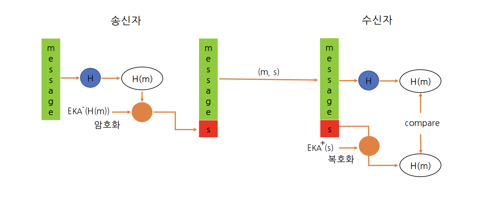 - 수신자는 송신자의 공개키로 메시지를 복호화하여 서명을 증명한다.