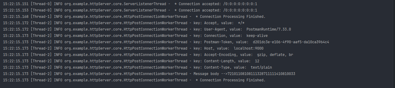 POST 요청의 경우에는 메시지 바디를 가진다. 따라서 현재 읽는 HTTP 메시지가 메시지 바디인지 아닌지를 표시하는 bodyFlag라는 boolean 값을 사용해 시작행과 메시지 헤더의 처리와 메시지 바디 처리 부분을 분리했다. 메시지 헤더는 문자열을 기반으로 하나의 행이라는 개념으로 각각 구분할 수 있으나 메시지 바디는 이런 행 기반 구조를 사용하지 않으므로 메시지 바디의 길이를 Content-Length 값으로 메시지 헤더에 지정하는 방식을 통해 메시지 바디를 처리할 수 있도록 작성했다.