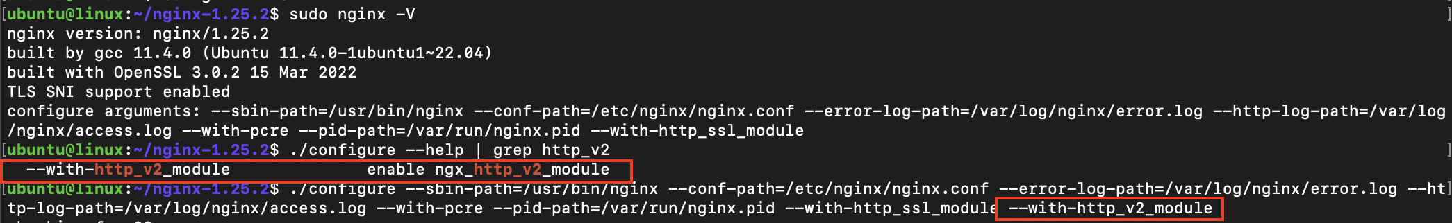 --with-http_v2_module 옵션을 추가하여 HTTP2 관련 모듈을 추가한다. make install까지 잘되었으면 sudo nginx -V를 통해 옵션이 잘 추가된 것을 확인할 수 있다.
