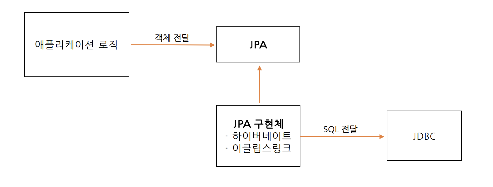 ORM은 객체를 관계형 데이터베이스 테이블과 매핑해주는 기술이다. 이 기술 덕분에 개발자는 반복적인 SQL을 직접 작성하지 않고, ORM 기술이 개발자 대신에 SQL을 동적으로 만들어 실행해준다. 추가로 각각의 데이터베이스마다 다른 SQL을 사용하는 문제도 중간에서 해결해준다. JPA는 자바 진영의 ORM 표준 인터페이스이고, 이것을 구현한 것으로 하이버네이트와 이클립스 링크 등의 구현 기술이 있다.