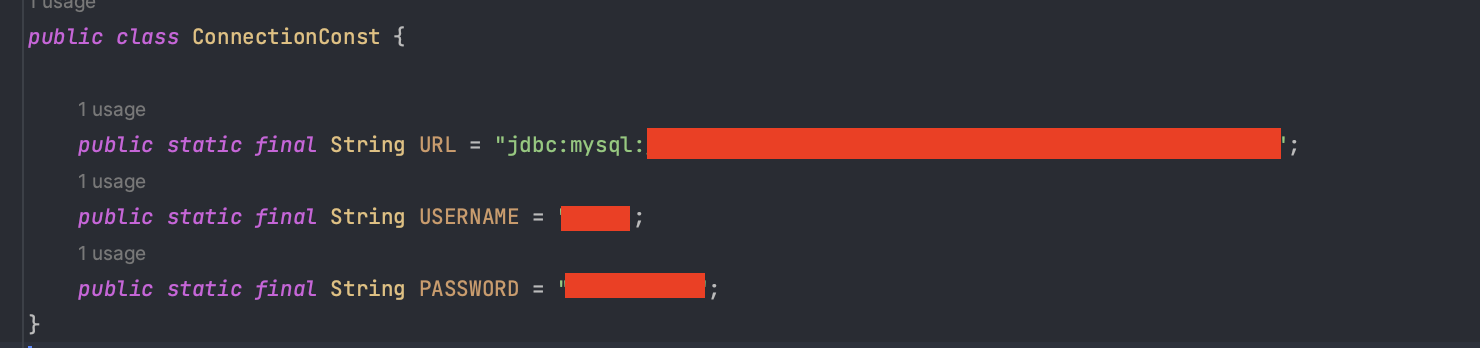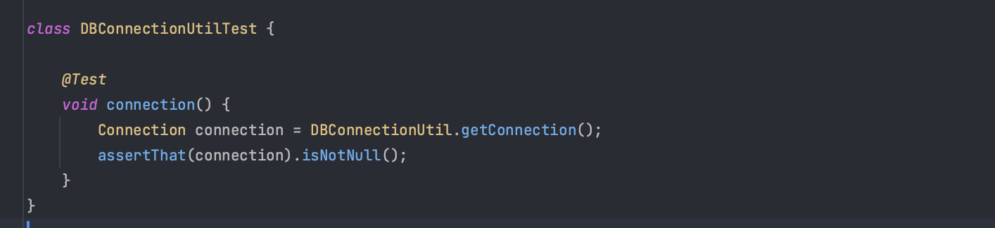 먼저, 데이터베이스에 접속하는데 필요한 기본 정보를 편리하게 사용할 수 있도록 상수로 만들었다. 이제 JDBC를 사용해서 실제 데이터베이스에 연결하는 코드를 작성해보자.
