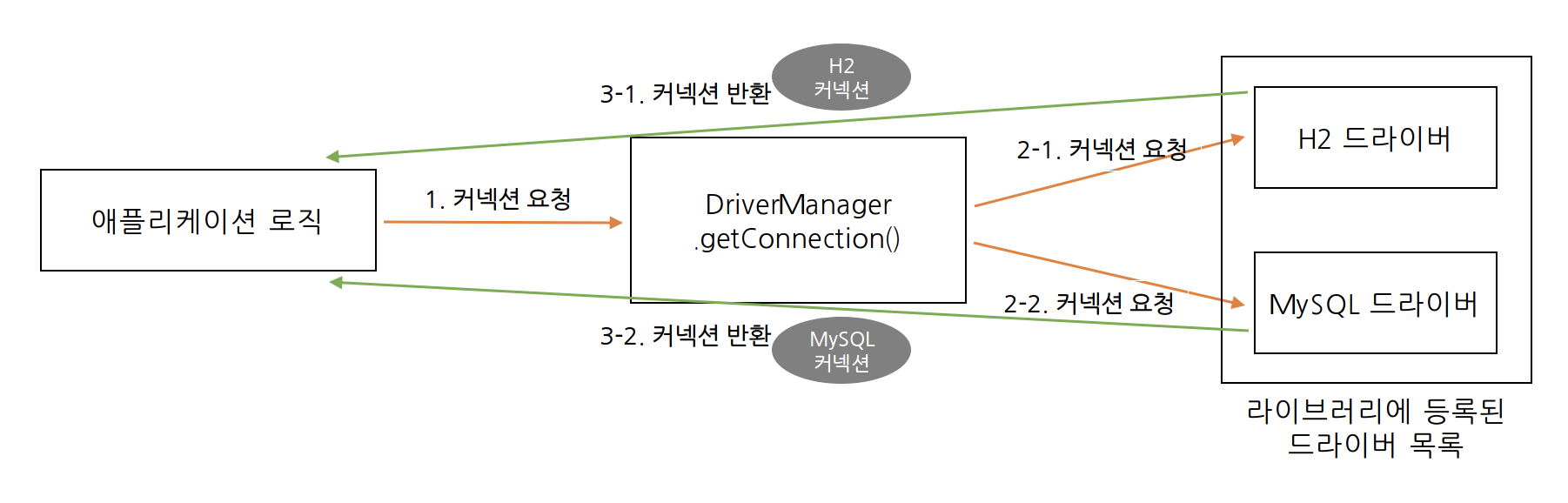 - 만약 MySQL 드라이버가 아닌 H2 드라이버가 먼저 본인이 처리할 수 있는지 확인하는데 만약 처리할 수 없다면 처리할 수 없다는 결과를 반환하게 되고, 다음 드라이버에게 순서가 넘어간다.