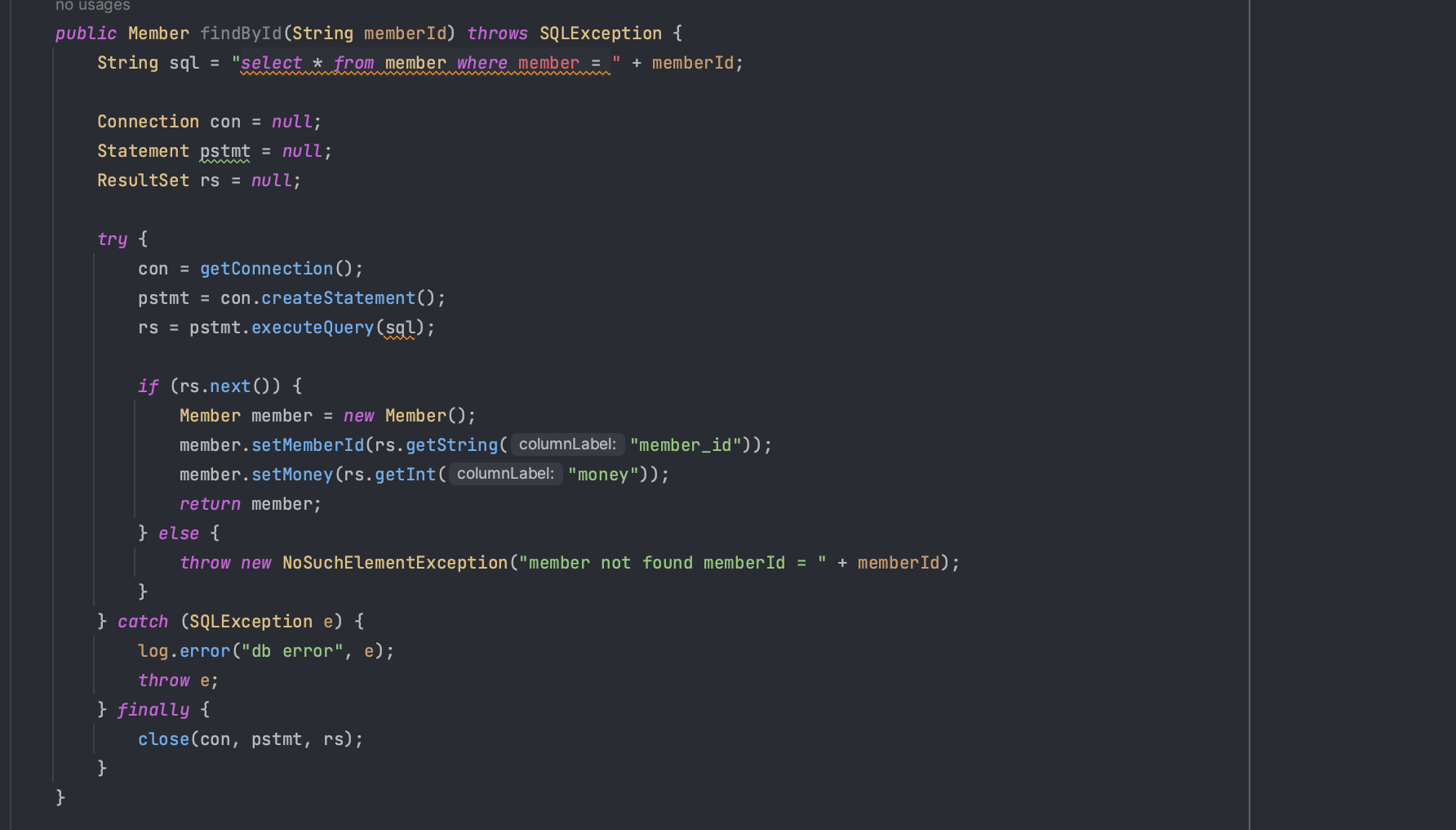 - pstmt.setString(1, member.getMemberId()): SQL의 첫 번째 ?에 값을 지정한다. 문자이므로 setString을 사용한다.