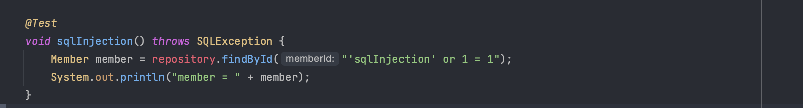 위 코드를 보는 것처럼 Statement를 사용하는 경우에 사용자 입력을 적절하게 검증 또는 이스케이프하지 않는 SQL 문을 작성하게 되면 의도치 않게 사용자 정보가 조회되는 경우가 발생할 수 있다.