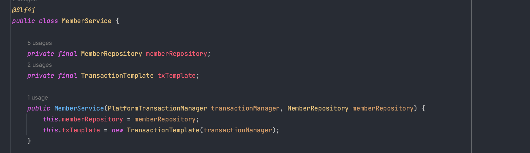 위 TransactionTemplate의 execute() 메서드를 보면 트랜잭션을 적용한 로직과 유사하다는 것을 확인할 수 있다. MemberService의 생성자에서 JdbcTemplate 객체를 생성할 때 전달한 transactionManager를 통해서 transaction.getTransaction()을 실행하는 것을 확인할 수 있고, action.doInTransaction() 메서드를 실행한다.