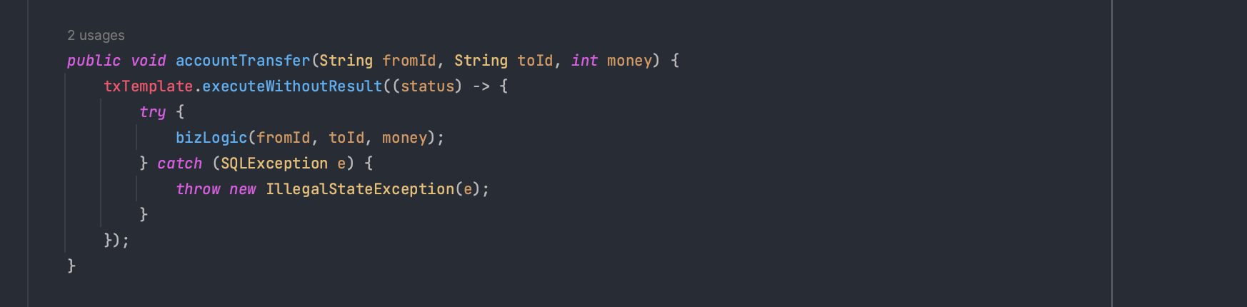 TransactionTemplate을 적용하면 다음과 같이 반복되는 트랜잭션 로직이 사라진 것을 확인할 수 있다. 어떻게 가능한지 TransactionManager가 내부적으로 어떻게 구현되어 있는지 살펴보자.