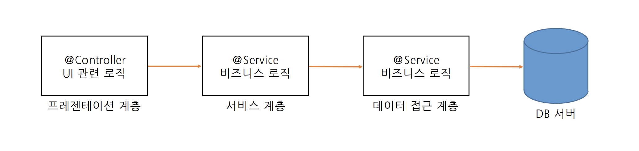 - 프레젠테이션 계층: UI와 관련된 처리 담당, 웹 요청과 응답, 사용자 요청을 검증