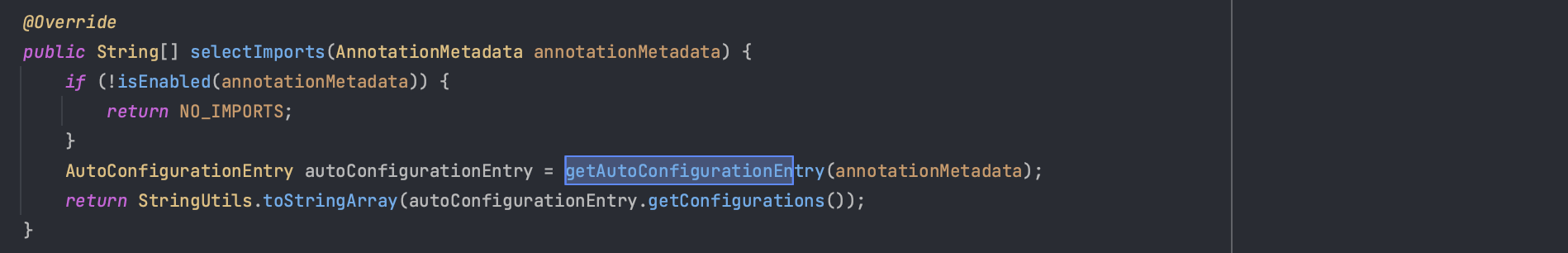 ImportSelector 인터페이스의 selectImports 메서드는 String 배열을 반환한다. 여기서 알 수 있듯이 org.springframework.boot.autoconfigure.AutoConfiguration.imports 파일들을 열어서 설정 정보를 선택하고, 해당 파일의 설정 정보가 스프링 컨테이너에 빈으로 등록되어 사용되는 것이다.
