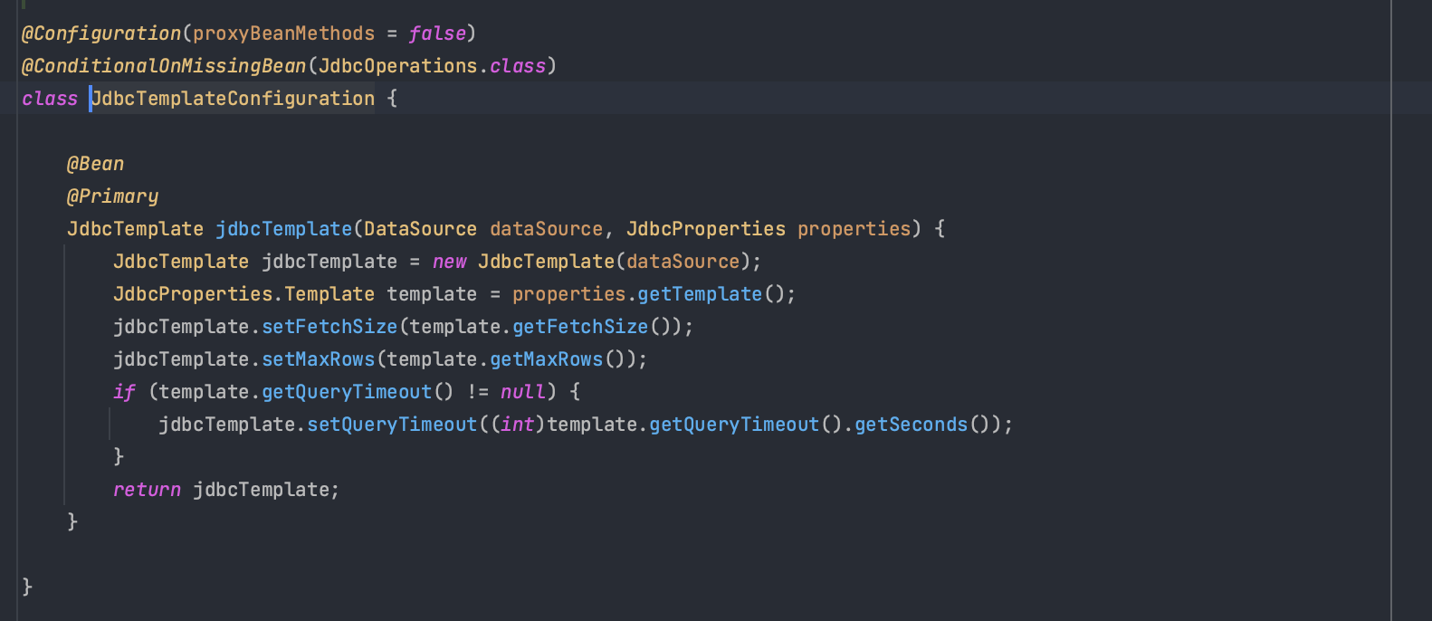 - @ConditionalOnMissingBean(JdbcOperaions.class): 해당 어노테이션은 조건부 자동 구성을 활성화한다. JdbcOperaions 빈이 컨텍스트에 등록되어 있지 않을 때만 이 자동 구성이 활성화되고, 이미 JdbcOperations 빈이 정의되어 있는 경우에는 클래스가 동작하지 않는다. 쉽게 말해, 개발자가 직접 작성한 JdbcTemplate이 빈으로 등록되어 있을 않을 때만 설정을 실행한다는 것이다.