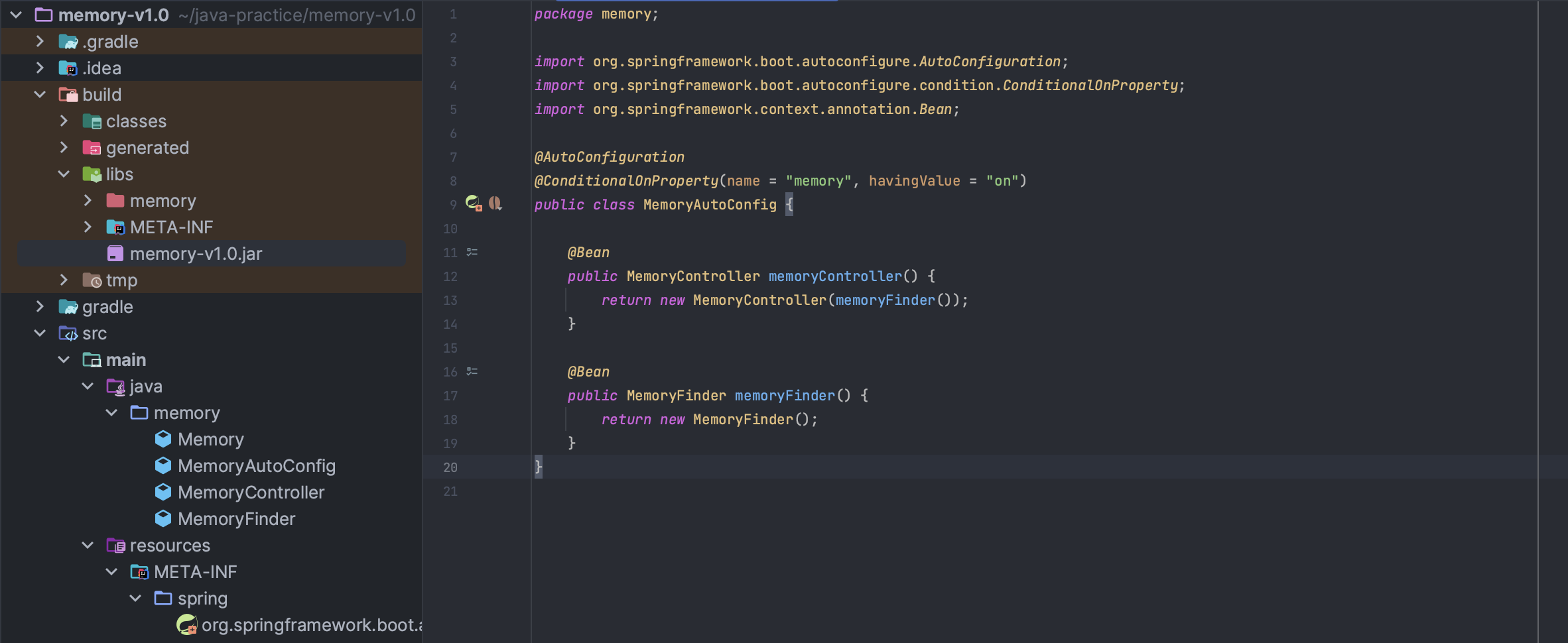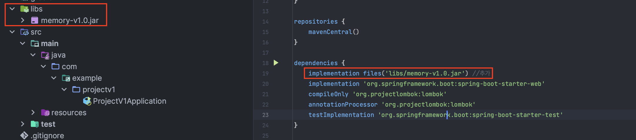 그리고 해당 프로젝트를 빌드하면 build/libs의 memory-v1.0.jar가 있는 것을 확인할 수 있다. 이를 다른 프로젝트의 라이브러리에 추가할 것이다.