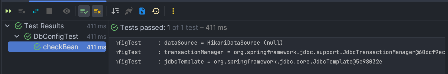 해당 빈들은 개발자가 직접 설정을 통해 스프링 컨테이너에 등록한 적이 없다. 하지만 테스트는 정상적으로 통과하고 출력결과에 DataSource, TransactionManager, TransactionManager 빈들이 존재하는 것을 확인할 수 있다. 이 빈들은 스프링 부트가 자동 구성(Auto Configuration) 기능을 통해 자동으로 등록해주는 것이다. 이러한 자동 구성 덕분에 개발자는 반복적이고 복잡한 빈 등록과 설정을 최소화하고 애플리케이션 개발을 빠르게 시작할 수 있다.