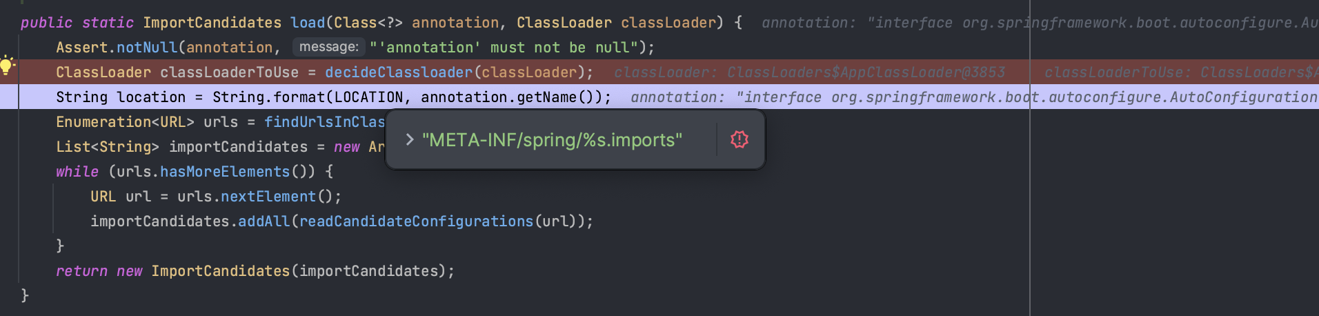 그리고 getCandidateConfigurations 메서드를 살펴보면 ImportCandidates의 load 메서드를 실행하는 것을 확인할 수 있고, 인자로 AutoConfiguration.class를 넘겨주고 있다. 그리고 load 메서드를 살펴보면 LOCATION 상수를 있는 것을 확인할 수 있는데 우리가 지금까지 살펴봤던 META-INF/spring/%s.imports 경로로 해당하는 경로의 모든 파일을 읽어서 자동 구성 클래스를 동적으로 등록한다.