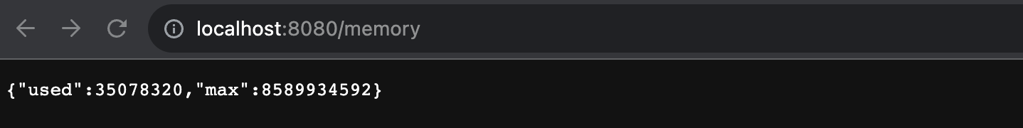 새로운 프로젝트에 libs/memory-v1.0.jar을 넣어놓고, VM Options에 -Dmemory=on 프로퍼티를 추가하고 실행하면 자동으로 빈으로 등록된 Controller에 의해 /memory 경로를 요청하면 위처럼 결과를 확인할 수 있다.
