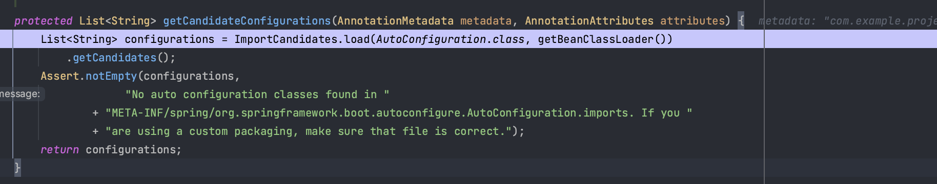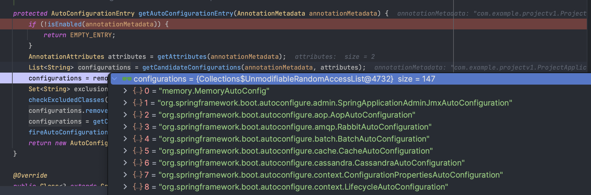 ImportSelector 인터페이스를 구현한 AutoConfigurationImportSelector 클래스의 selectImports 메서드에는 getAutoConfigurationEntry 메서드가 있고 해당 메서드를 디버거를 통해 살펴보면 configurations에는 org.springframework.boot.autoconfigure.AutoConfiguration.imports 파일들의 자동 구성 클래스들이 있는 것을 확인할 수 있다.