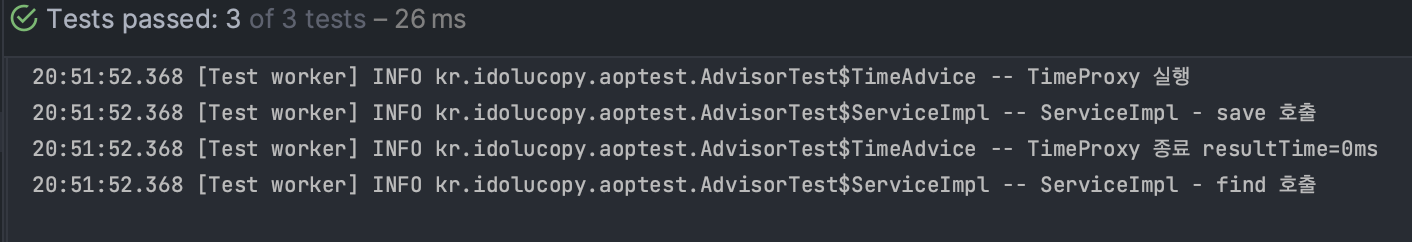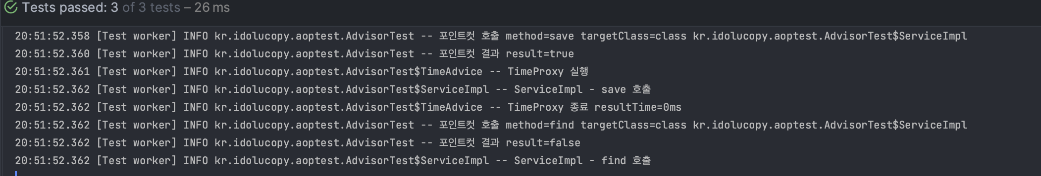 하나의 ProxyFactory에 여러 어드바이저를 적용할 수 있다. 등록한 순서대로 호출되는 것을 확인할 수 있다. 즉, 하나의 target에 여러 AOP가 동시에 적용되어도 각각의 프록시를 생성하는 것이 아닌 하나의 프록시만 생성하여 여러 어드바이저를 적용한다는 점을 주의해야 한다.