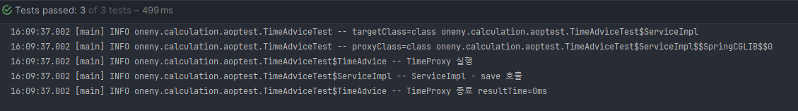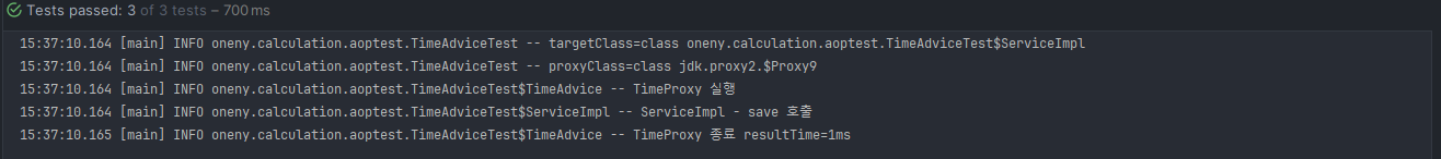 결과를 보면 프록시 객체가 ServiceImple 객체가 아닌 프록시 객체인 것을 확인할 수 있다. 이는 위에서 살펴본대로 proxy 객체의 save() 메서드를 호출하면 addAdvice를 통해 추가한 Advice가 호출되어 TimeProxy 실행 메시지와 TimeProxy 종료 메시지가 출력된 것을 확인할 수 있다.