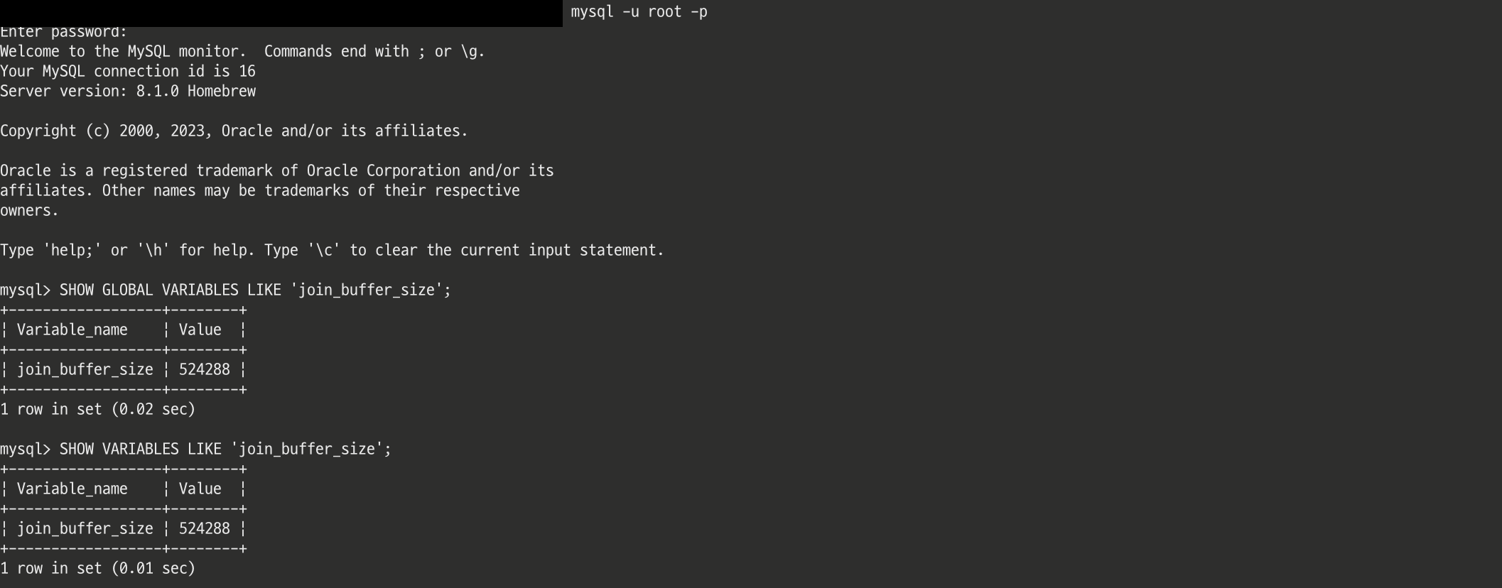 시스템 변수의 변위가 'Both'인 경우(글로벌이면서 세션 변수인)에는 글로벌 시스템 변수의 값을 변경해도 이미 존재하는 커넥션의 세션 변수값은 변경되지 않고 그대로 유지된다. 동적으로 변경 가능한 join_buffer_size라는 Both 타입 변수로 확인하면 글로벌 변수값은 524288으로 변경됐지만, 현재 커넥션의 세션 변수는 예전의 값인 262144를 그대로 유지하고 있음을 확인할 수 있다.
