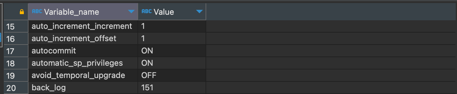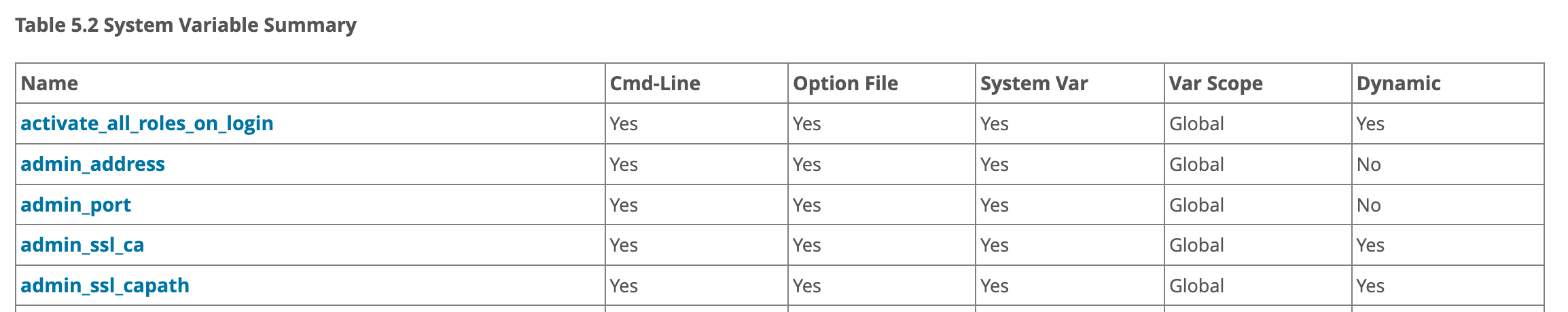 - System Var: 시스템 변수인지 아닌지를 나타낸다. MySQL 서버의 설정 파일을 작성할 때 각 변수명에 사용된 하이픈('-')이나 언더스코어('_')의 구분에 주의해야 한다. 이는 MySQL 서버가 예전부터 수많은 사람들의 손을 거쳐오면서 생긴 일관성 없는 변수의 명명 규칙 때문이다. 어떤 변수는 하이픈으로 구분되고 어떤 시스템 변수는 언더스코어로 구분되는 등 상당히 애매모호한 부분이 있는데, 뒤늦게 이런 부분을 언더스코어로 통일해가는 중이다. 현재 MySQL 8.0에서는 모든 시스템 변수들이 '_'를 구분자로 사용하도록 변경된 것으로 보인다. 그리고 명령행 옵션으로만 사용 가능한 설정들은 '_'가 아니라 '-'을 구분자로 사용한다.