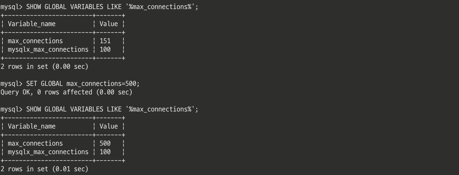 위에서 SET 명령어를 통해서 시스템 변수의 값을 변경하는 것은 현재 기동중인 MySQL 서버 인스턴스에만 유효하다고 했다. 따라서 시간이 지나 MySQL 서버를 재시작하여 원래의 시스템 변수의 값으로 돌아가 장애가 발생할 수도 있게 된다. 이를 위해 MySQL 8.0 버전에서는 SET PERSIST 명령을 도입하여 해결하였다.