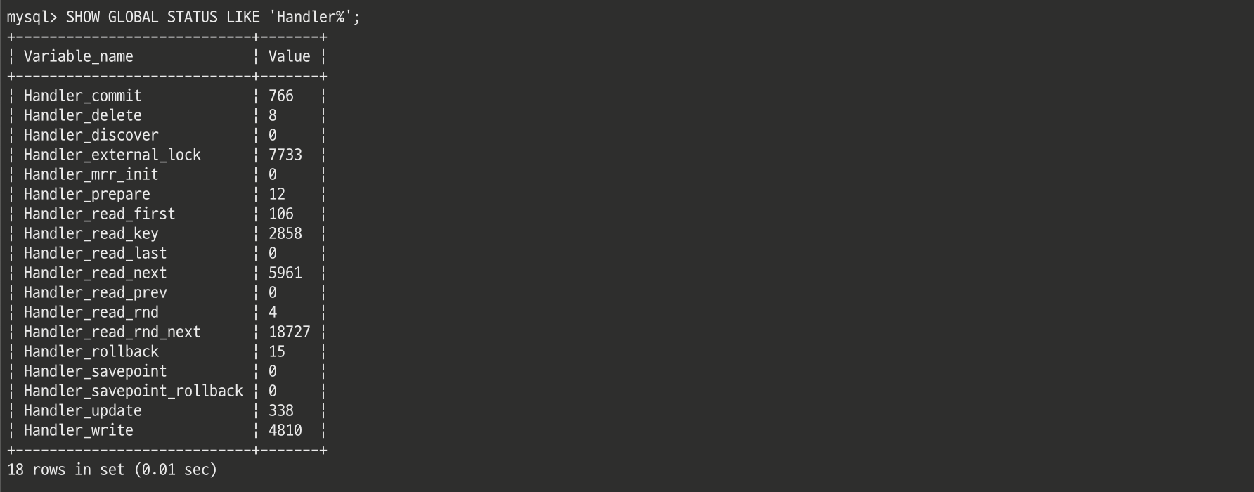 MySQL 엔진의 쿼리 실행기에서 데이터를 쓰거나 읽어야 할 때는 각 스토리지 엔진에 쓰기 또는 읽기를 요청하는데, 이러한 요청을 핸들러(Handler) 요청이라 하고, 여기서 사용되는 API를 핸들러 API라고 한다. InnoDB 스토리지 엔진 또한 이 핸들러 API를 이용해 MySQL 엔진과 데이터를 주고받는다. 이 핸들러 API를 통해 얼마나 많은 데이터(레코드) 작업이 있었는지는 SHOW GLOBAL STATUS LIKE 'Handler%'; 명령을 통해 확인할 수 있다.