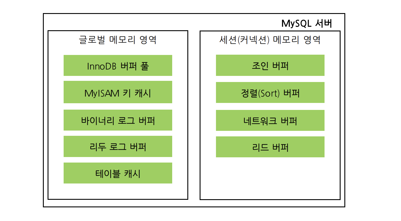MySQL에서 사용되는 메모리 공간은 크게 글로벌 메모리 영역과 로컬 메모리 영역으로 구분할 수 있다. 글로벌 메모리 영역의 모든 메모리 공간은 MySQL 서버가 시작되면서 운영체제로부터 할당된다. 즉, MySQL의 시스템 변수로 설정해 둔 만큼 운영체제로부터 메모리를 할당받는다고 생각하면 좋다.